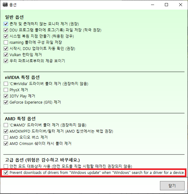 3. DDU 설정에서 저 빨간 네모친걸 체크함. Windows 업데이트에서 드라이버를 자동으로 받아와서 설치하는 걸 막는 옵션임.