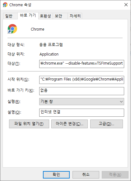 크롬 바로가기에 인자로