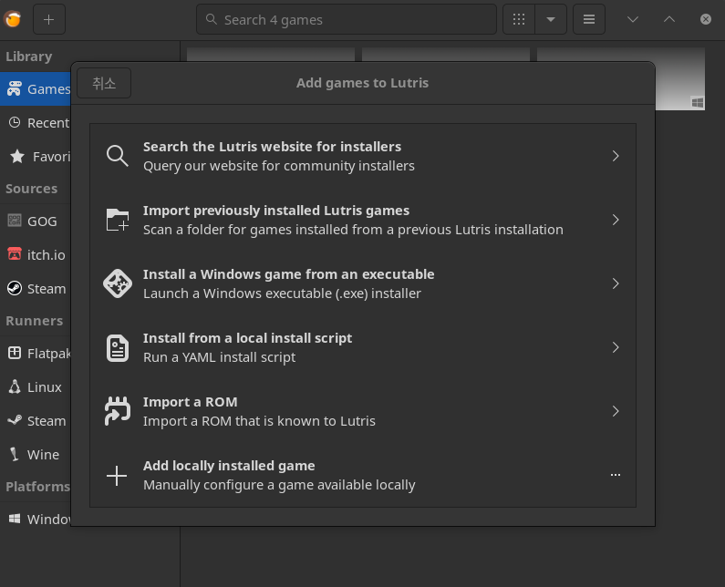 폴더를 생성했다면 다시 Lutris를 실행하고, 좌상단 +를 누른 다음 Add locally installed game을 선택합니다.