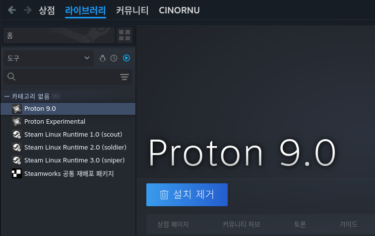 8. 스팀을 켜고, 라이브러리에서 도구만을 선택해서 가장 최신 버전인 Proton을 찾아요.