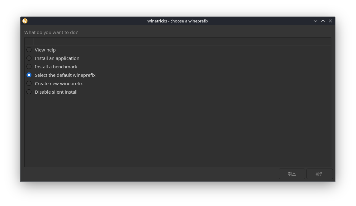 7. 창이 뜨면 Select the default wineprefix에 들어간 다음에 아래 두 메뉴에서 필요한 일부 파일만을 설치해야해요.