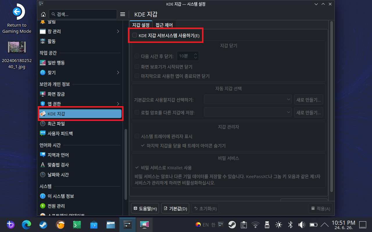 SteamOS는 KWallet이 기본 내장되어있지 않기때문에 이 메뉴가 설정에 안 뜹니다